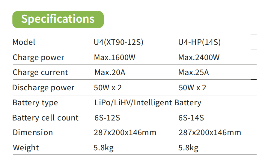 | 模型 | U4(XT90-12S) | U4-HP(14S) |